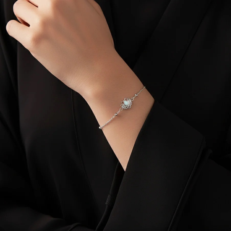 سوار فضة نسائي عيار 925 بتصميم زهرة اللوتس الأنيقة مرصع بحجر الأوبال الأبيض اللامع، يرمز للنقاء والطاقة الإيجابية. قطعة فاخرة تضيف لمسة أنوثة راقية تناسب الهدايا والمناسبات الخاصة. مثالي لعاشقات الأناقة ومحبات مجوهرات الفضة الراقية.