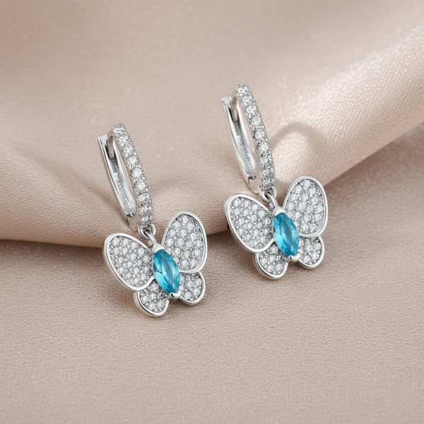حلق فراشة زرقاء فضة أصلية 925 بتصميم أنثوي راقٍ