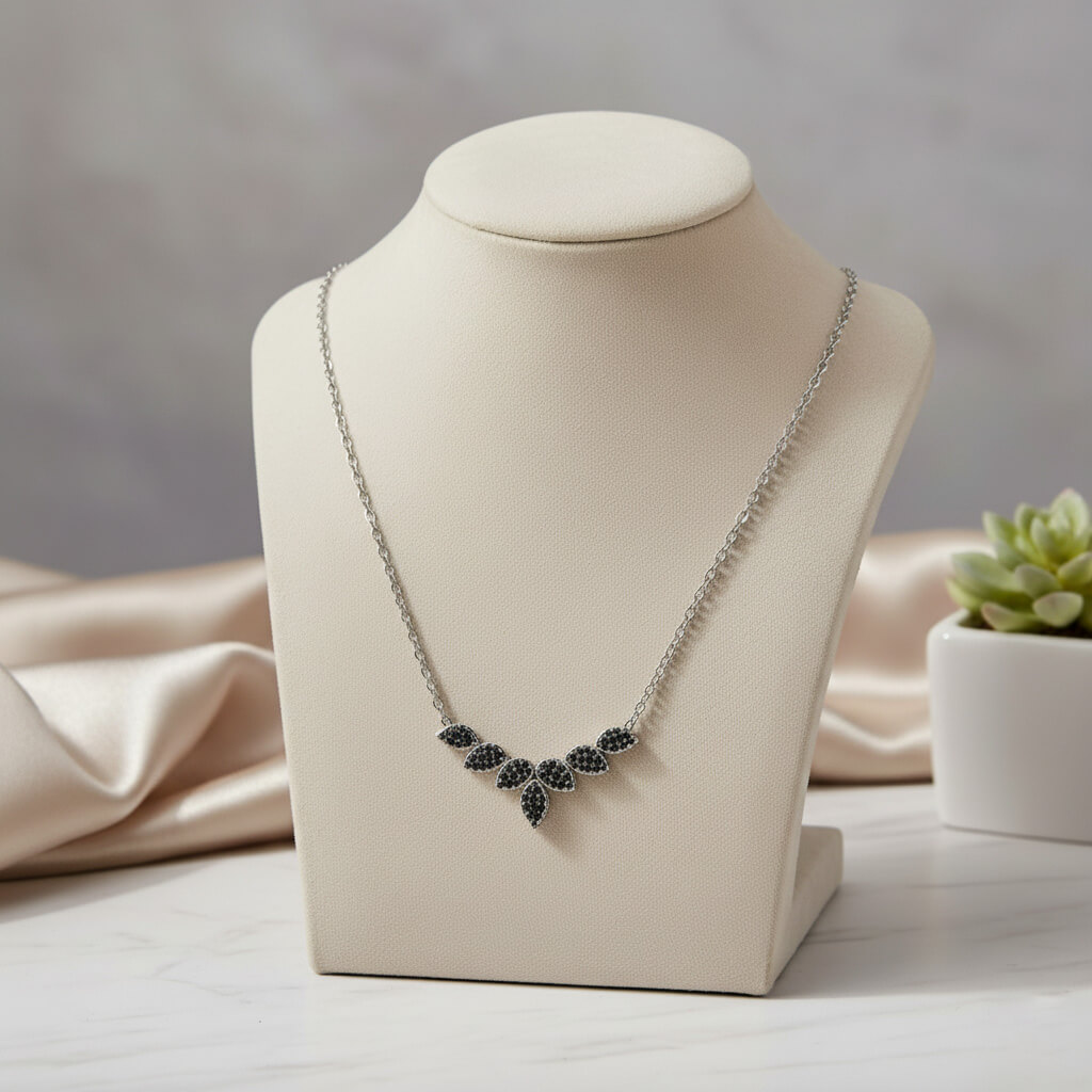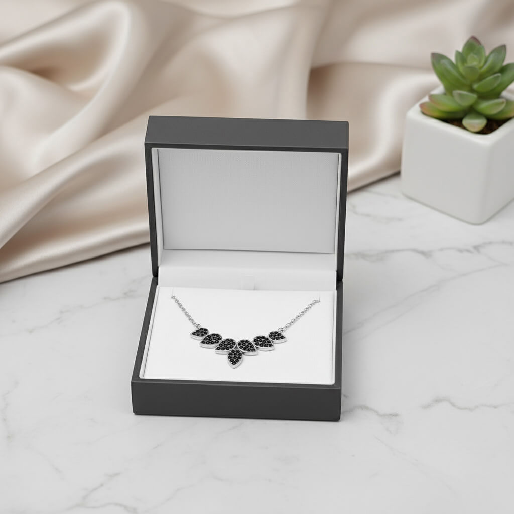 تألّقي بإطلالة فخمة مع قلادة أوراق الزركون الأسود الفاخرة المصنوعة من الفضة الإسترليني 925، بتصميم أنثوي أنيق يعكس الذوق الرفيع والفخامة الهادئة. مثالية للمناسبات الخاصة والهدايا الراقية