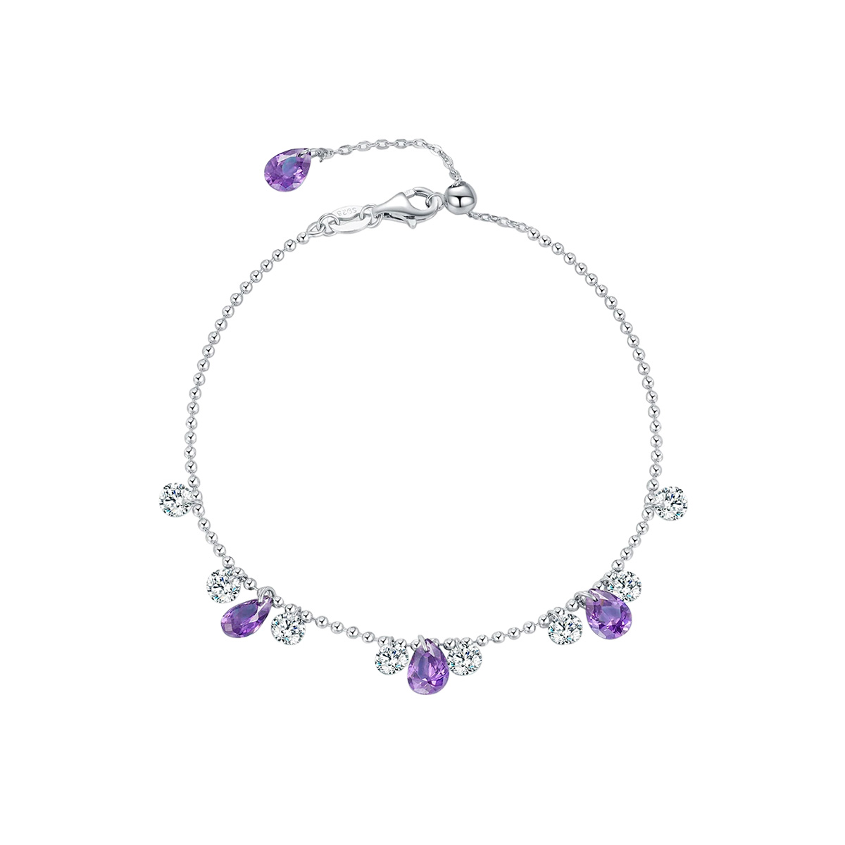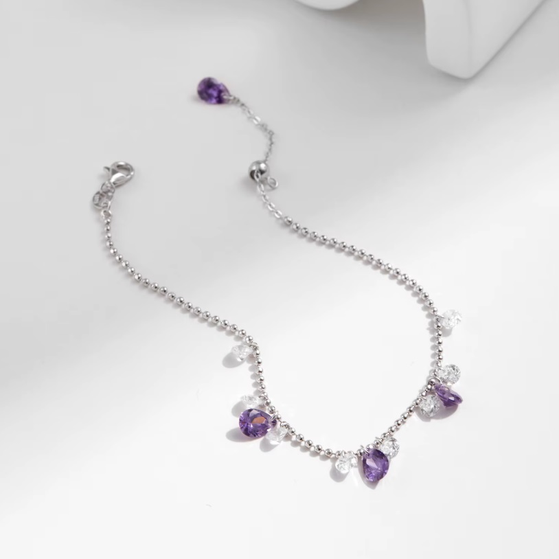 سوار فضة نسائي فخم بتصميم خرز متصل وحجر زركون بنفسجي بشكل قطرة ماء يمنح معصمك لمسة أنوثة راقية. قطعة مثالية لعاشقات الإكسسوارات الفخمة والمجوهرات النسائية الفاخرة.