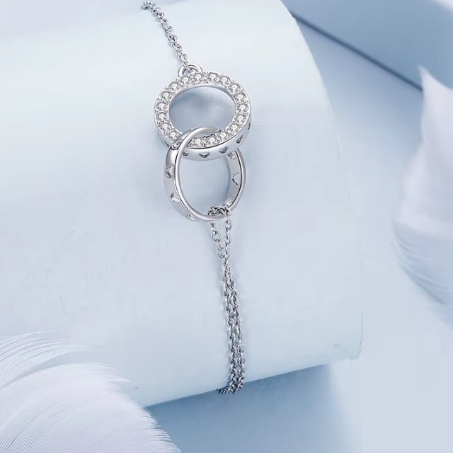تألقي بإطلالة أنثوية راقية مع هذه الاسورة الفضية المصنوعة من الفضة والمطلية بالبلاتين الفاخر. تتميز بتصميم عصري يجمع بين الدائرتين المتداخلتين المزدانتين بزركون لامع، يرمزان إلى الترابط والحب الأبدي. خفيفة الوزن وقابلة للتعديل لتناسب جميع المقاسات بسهولة، مما يجعلها هدية مثالية للأحبة في المناسبات الخاصة.