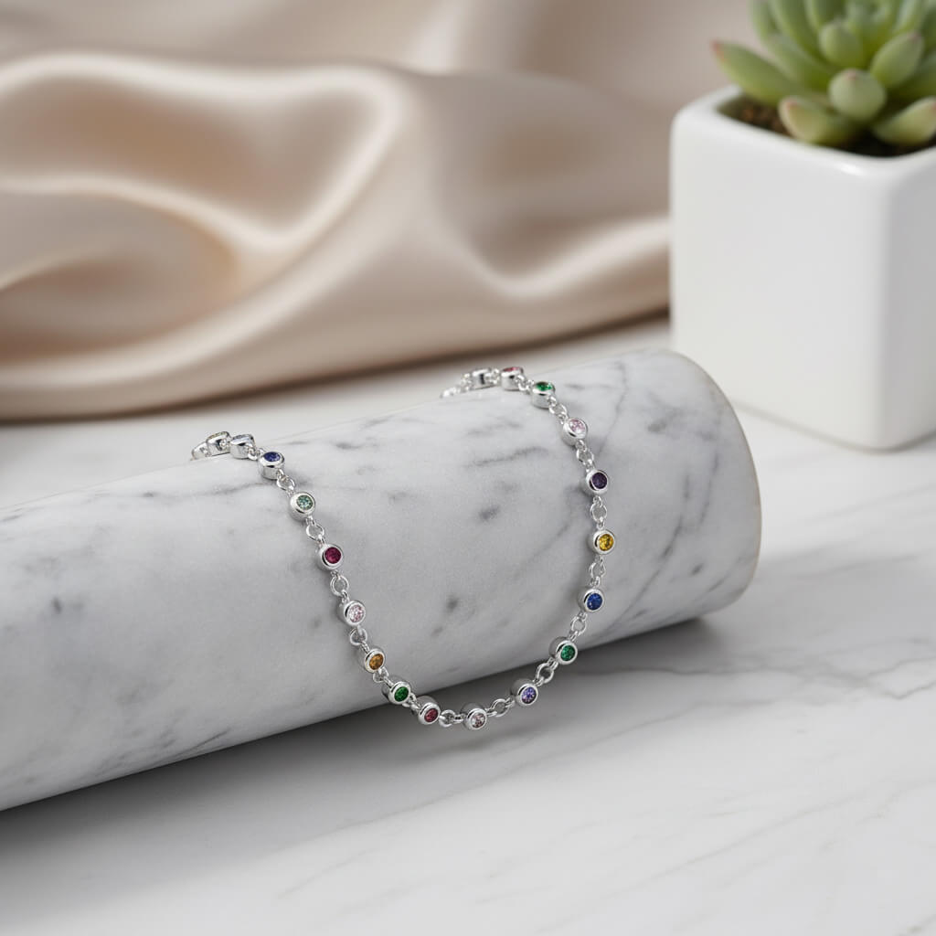 اسورة فضة نسائية أنيقة بتصميم بوهيمي راقٍ، مرصعة بأحجار زركون ملونة تمنحك لمسة من الأناقة والجاذبية في كل مناسبة