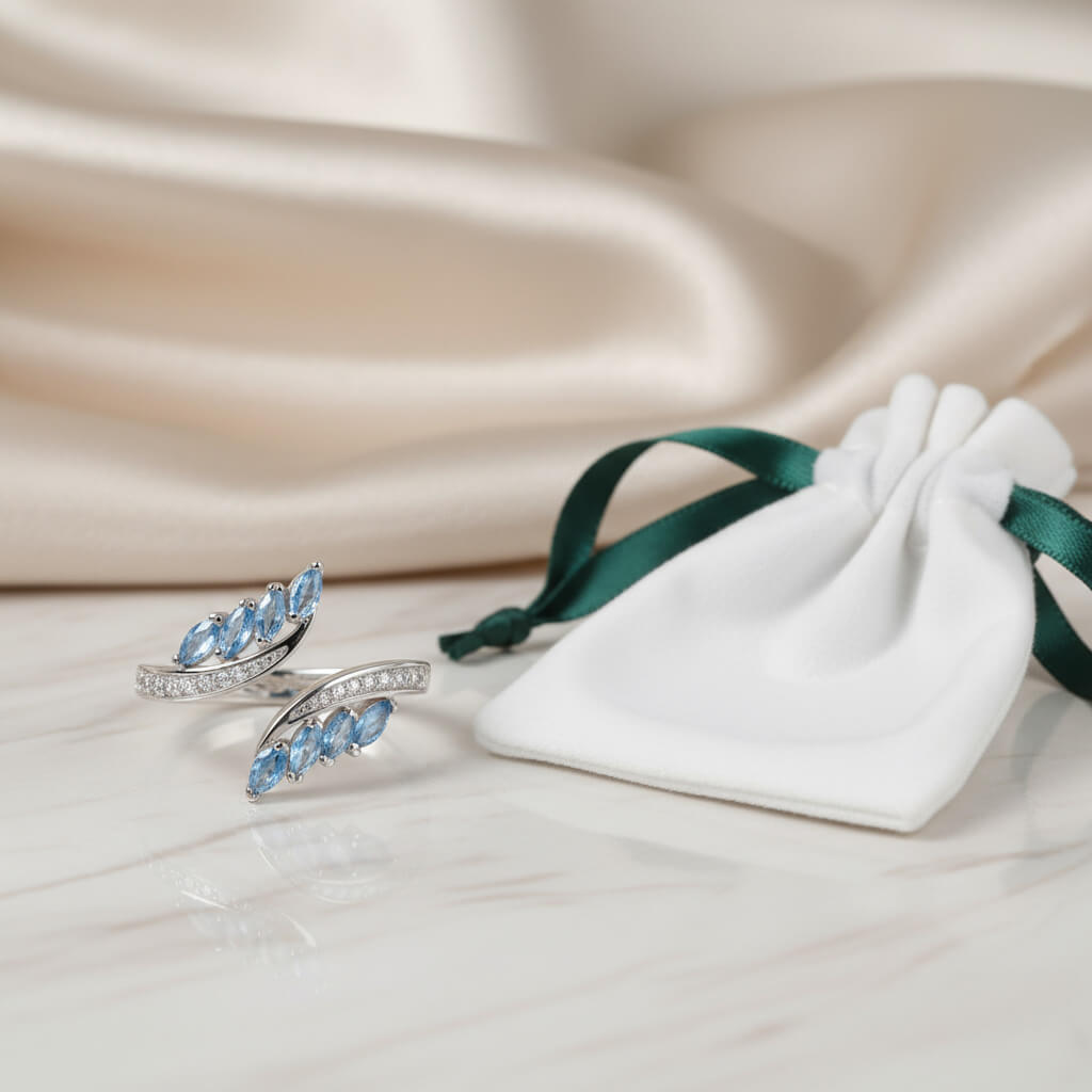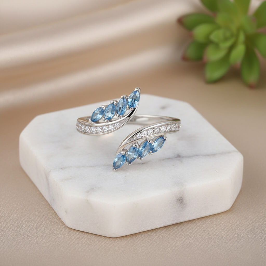 خاتم فضة نسائي أنيق بتصميم أوراق الصفصاف المرصعة بحجر زركون أزرق لامع، يمنحك لمسة فخمة تبرز أنوثتك في كل مناسبة. تصميم قابل للتعديل يناسب مختلف المقاسات من 5-8، مثالي كهديّة راقية أو لإكمال إطلالتك اليومية بأسلوب فاخر
